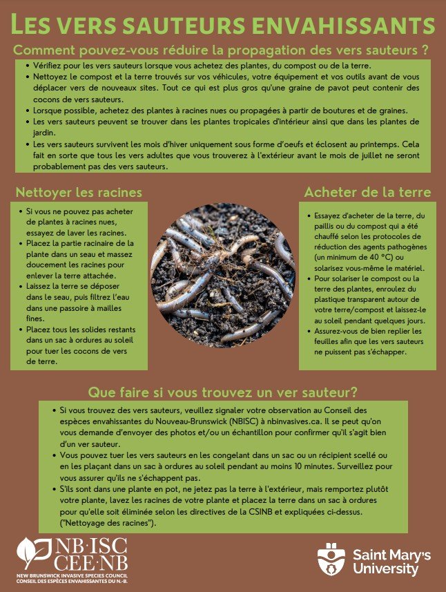 We’re working with Dr. Erin Cameron and her team from Saint Mary’s University to share information about Jumping Worms and how you can keep them from spreading into your backyard. See the infographics below for more information, and report any possible sightings of Jumping Worms to us immediately through the “Report an Invasive Species” page on our website or by emailing info@nbinvasives.ca. When submitting a possible observation, please include the date they were seen, the location, and any photos of the worms that you have taken (if reporting the sighting through our website, please send us any photos separately by email).